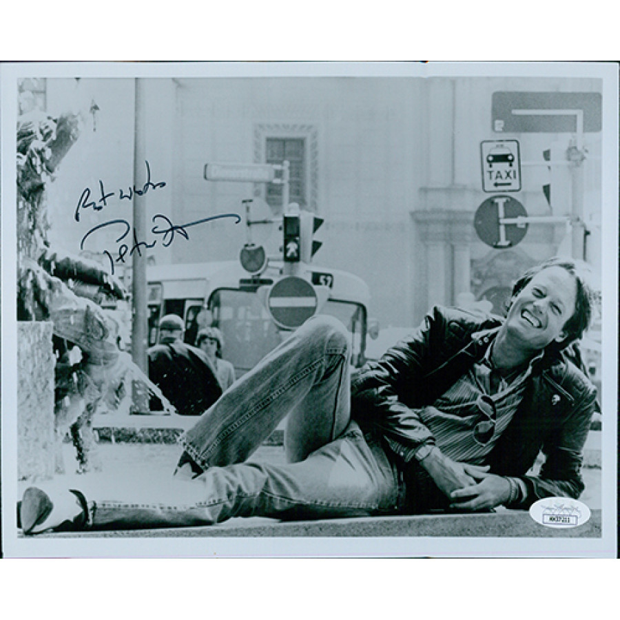 Signed Peter Fonda 8x10 glossy photo in black ink with "Best Wishes" inscription. This item has been certified by James Spence Authentication (JSA) with sticker affixed to item and matching card.