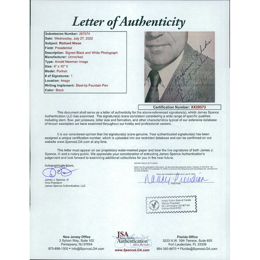 Signed President Richard Nixon 6.5x8.5 cardstock photo in black ink personalized. The photo does have a few punctures in the upper left area. This item has been certified by James Spence Authentication (JSA) with sticker affixed to item and matching letter of authenticity.