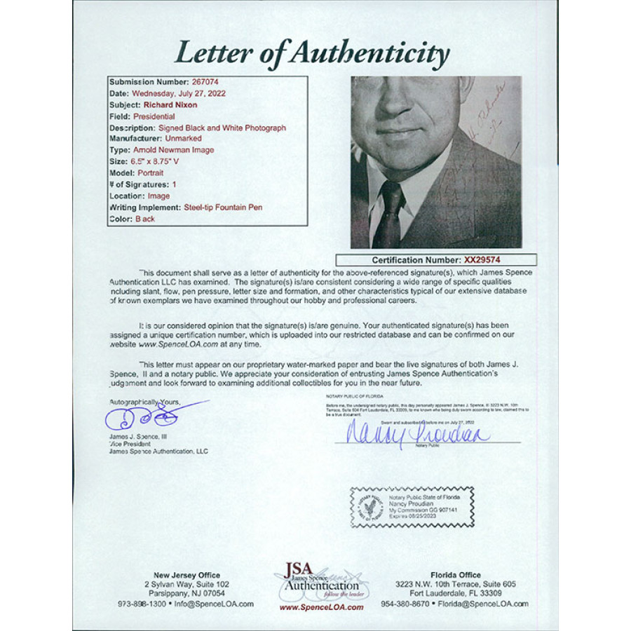 Signed President Richard Nixon 8x10 cardstock photo in black ink personalized. The photo does have a a piece taken out on the top right corner, some tears, kinks and tape around the back boarder. This item has been certified by James Spence Authentication (JSA) with sticker affixed to item and matching letter of authenticity.