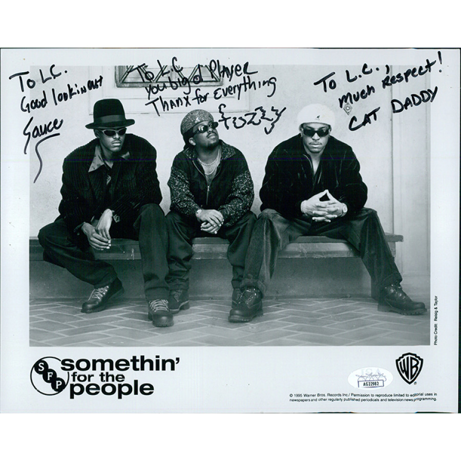 Signed Somethin' For The People Curtis "Sauce" Wilson, Rochad "Cat Daddy" Holiday and Jeff "Fuzzy" Young 8x10 matte finish promo photo in black sharpie by all three personalized "To LC". The photo has staple holes around the boarder and some light creases and kinks. This item has been certified by James Spence Authentication (JSA) with sticker on item and matching card.