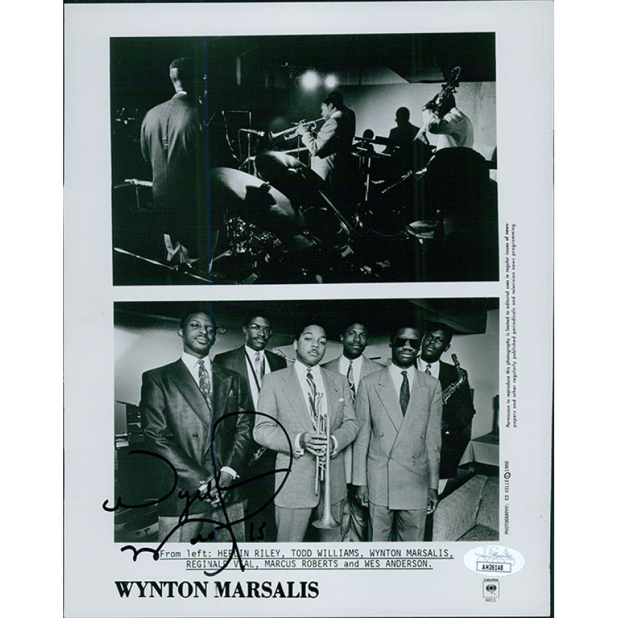 Signed Wynton Marsalis 8x10 glossy finish Promo photo in black sharpie. The photo has some kinks and scratches. This item has been certified by James Spence Authentication (JSA) with sticker affixed to item and matching card.