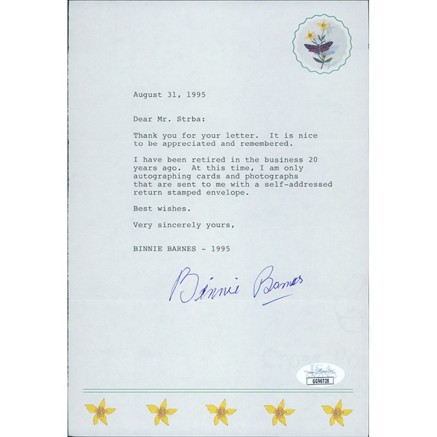 Signed Binnie Barnes 6x9 typed autograph request reply letter in blue ink. This item has been certified by James Spence Authentication (JSA) with sticker affixed to item and matching card.