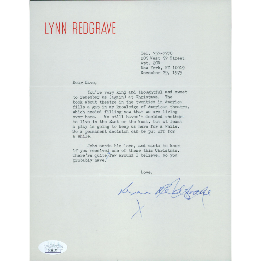 Signed Lynn Redgrave Typed Personal 7x9 Note To David Tebet who was the NBC Talent VP on personal stationary dated 12/29/1975 in blue pen. This item comes certified by James Spence Authentication (JSA) with sticker affixed to item and matching card.