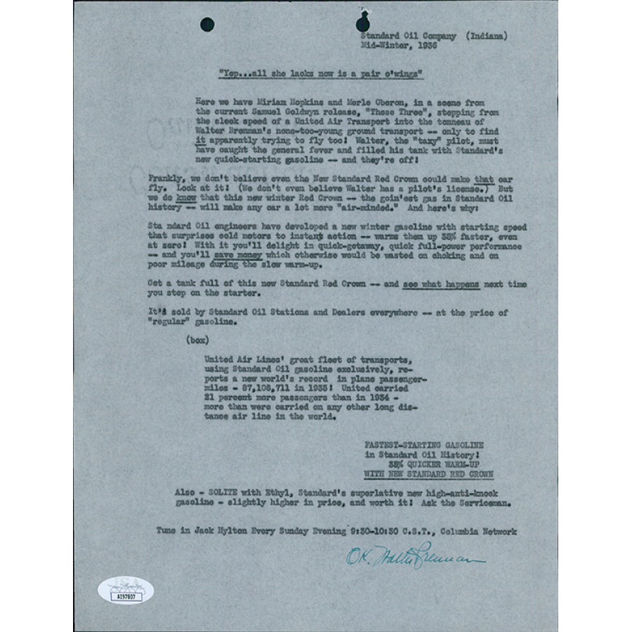 Signed Walter Brennan These Three page in green ink. There are some small tears and crease marks. This item is certified by James Spence Authentication (JSA) with sticker affixed to item and matching card.