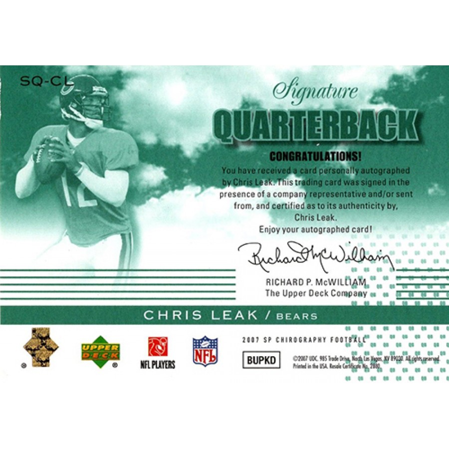 Chris Leak Chicago Bears Signed 2007 Upper Deck SP Chirography Signature Quarterbacks Emerald Football Card #SQ-CL. This is numbered 24 of 50.