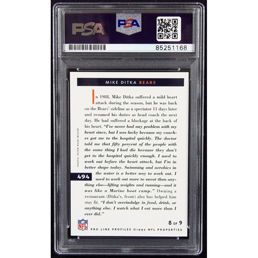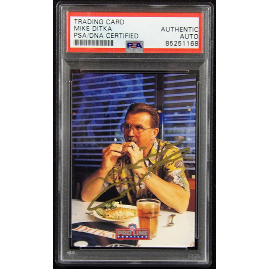 Signed Mike Ditka Chicago Bears 1992 Pro Line Profiles card #494 in gold ink. This item is certified by Professional Sports Authenticator (PSA) encapsulated.