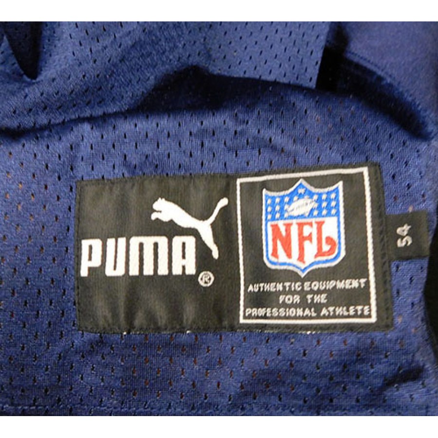 Signed Derrick Mason Tennessee Titans Authentic Puma Jersey size 54 in blue sharpie on the back number. This item is certified by James Spence Authentication (JSA) with sticker affixed to item and matching card.