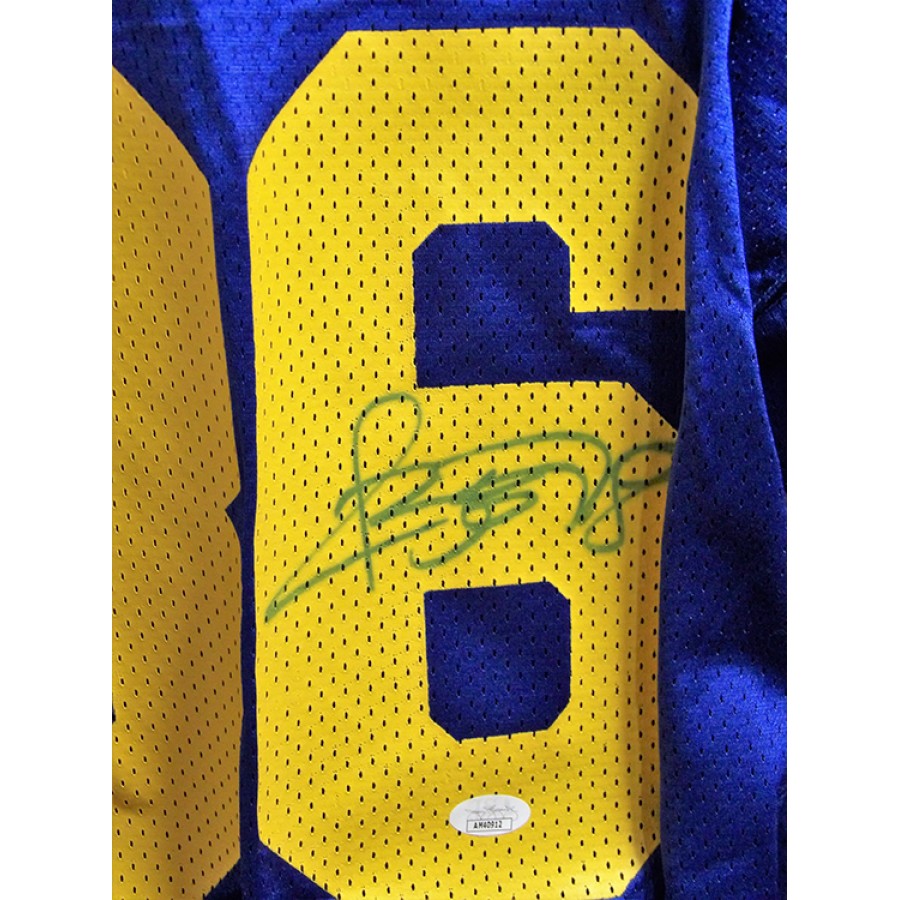 Signed Jerome Bettis Los Angeles Rams Authentic Starter Jersey size 52 in blue sharpie on the back number. The signature has bleed/faded into the jersey. This item is certified by James Spence Authentication (JSA) with sticker affixed to item and matching card.