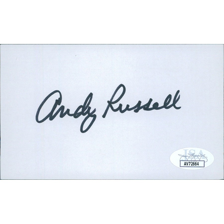 Signed Andy Russell 3x5 index card in black sharpie. This item has been certified by James Spence Authentication (JSA) with sticker affixed to item and matching card.