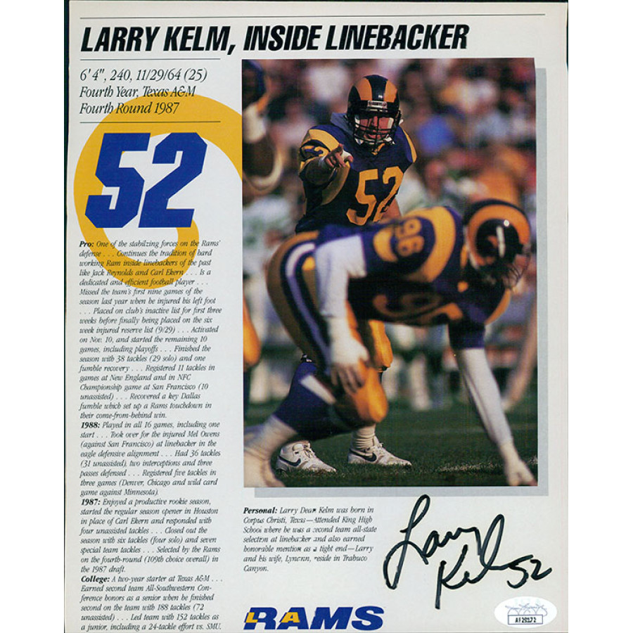 Signed Larry Kelm Los Angeles Rams 8x10 cut magazine page in black sharpie. This item is certified by James Spence Authentication (JSA) with sticker affixed to item and matching card.