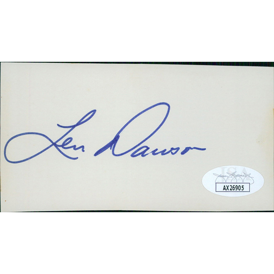 Signed Len Dawson 2.25x4.5 cut cardstock card in blue sharpie. This item has been certified by James Spence Authentication (JSA) with sticker on item and matching card.