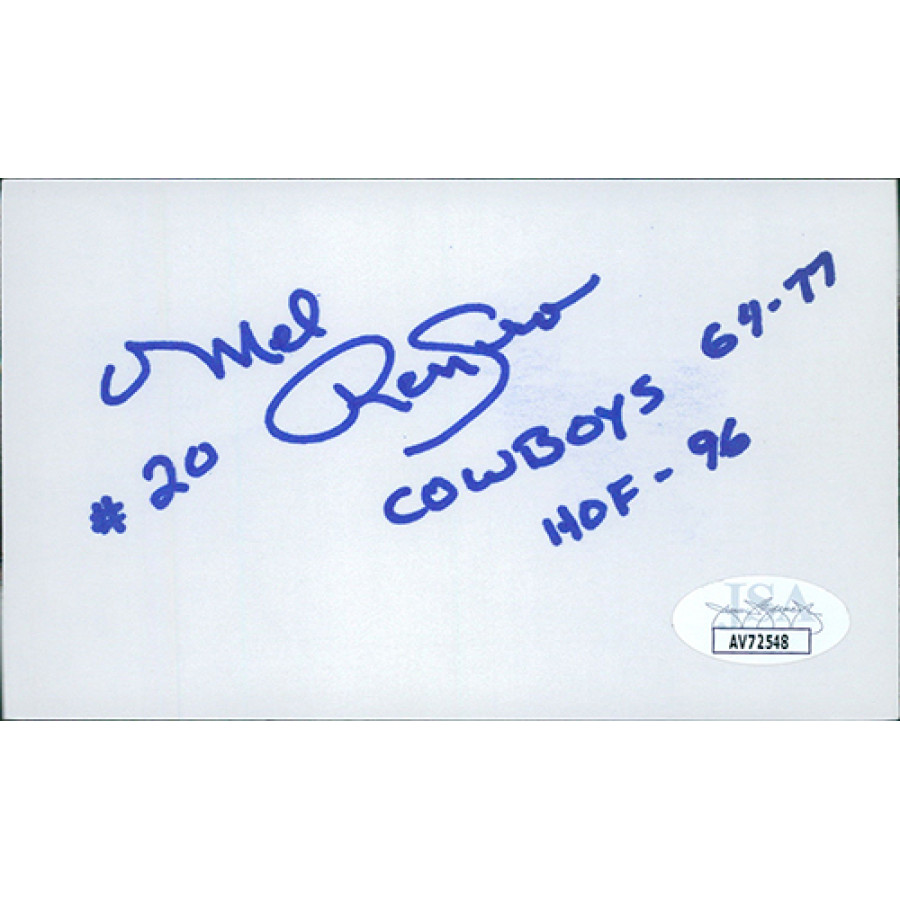 Signed Mel Renfro 3x5 Index Card in blue sharpie with multiple inscriptions. There is some light blue staining on the card. This item has been certified by James Spence Authentication (JSA) with sticker on item and matching card.
