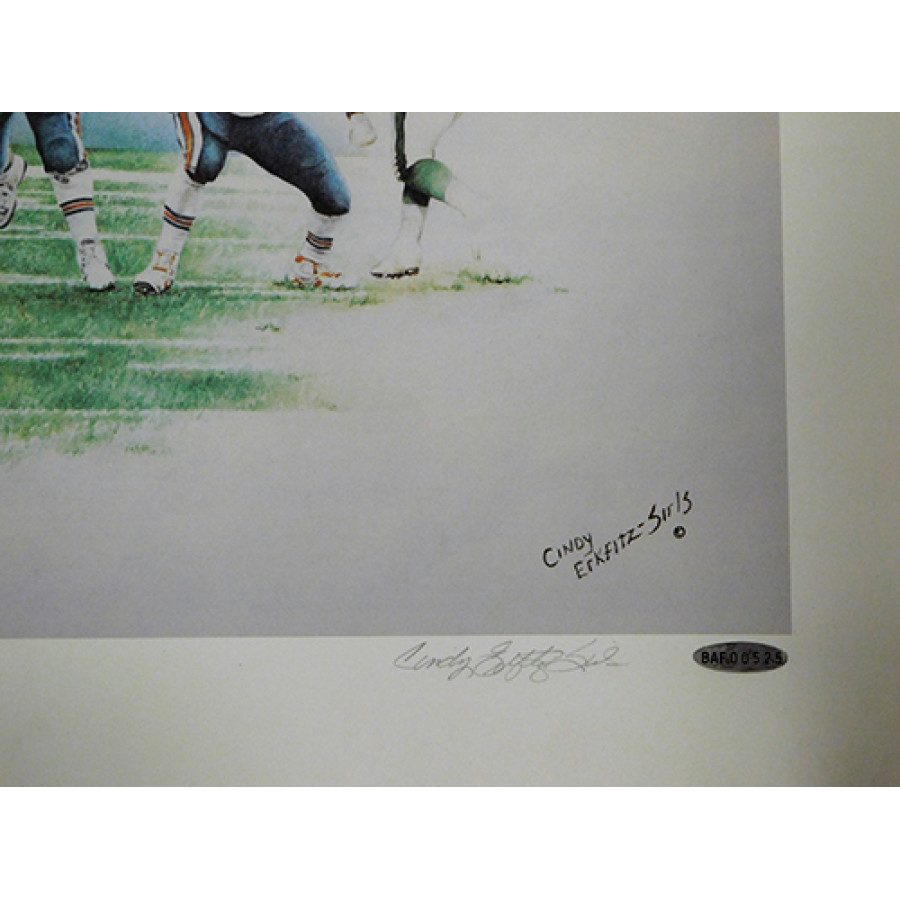 Signed Miami Dolphins Dan Marino and Mark Clayton 18.5x21Limited Edition Lithograph. The litho is individually numbered to 959. There are dirt marks, bent corners and tears in the boarder. The signatures have faded a little. This is also signed by the artist. This item is certified by Upper Deck Authentication (UDA) with sticker affixed to item and matching card.