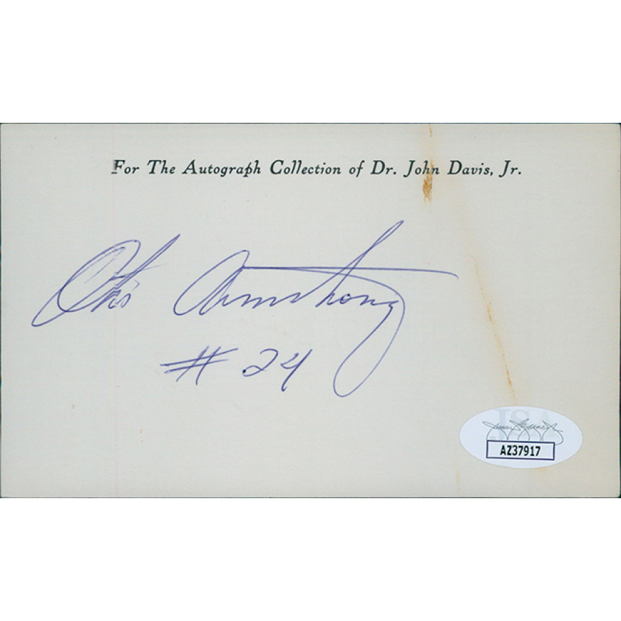 Signed Otis Armstrong 3x5 index card in blue ink. This item has been certified by James Spence Authentication (JSA) with sticker affixed to item and matching card.