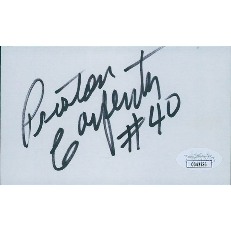 Signed Preston Carpenter 3x5 index card in black sharpie. This item has been certified by James Spence Authentication (JSA) with sticker affixed to item and matching card.