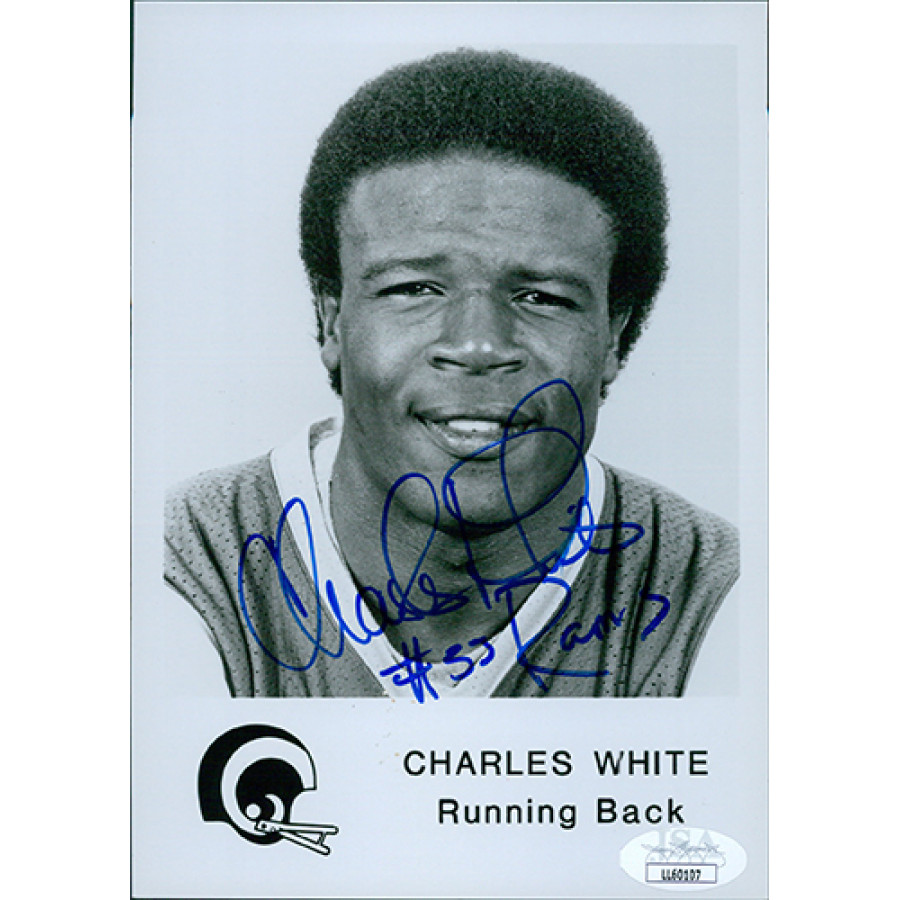 Signed Charles White Los Angeles Rams 5x7 Glossy finish promo photo in blue sharpie. This item has been certified by James Spence Authentication (JSA) with sticker affixed to item and matching card.