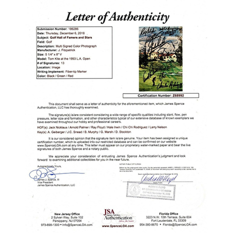 Signed Golf Hall of Famers and stars signed cut program 5.25x8 cover by 13 golfers. Players are Jack Nicklaus, Arnold Palmer, Ray Floyd, Hale Irwin, Chi Chi Rodriguez & Larry Nelson Al Geiberger, J.C. Snead, Bob Murphy, Graham Marsh and Dave Stockton. This item has been authenticated by James Spence Authentication (JSA) and will come with a sticker on the item and a letter of authenticity. NOTE: There is some scratches/dents/crease marks and on the back there was some sticky tape.