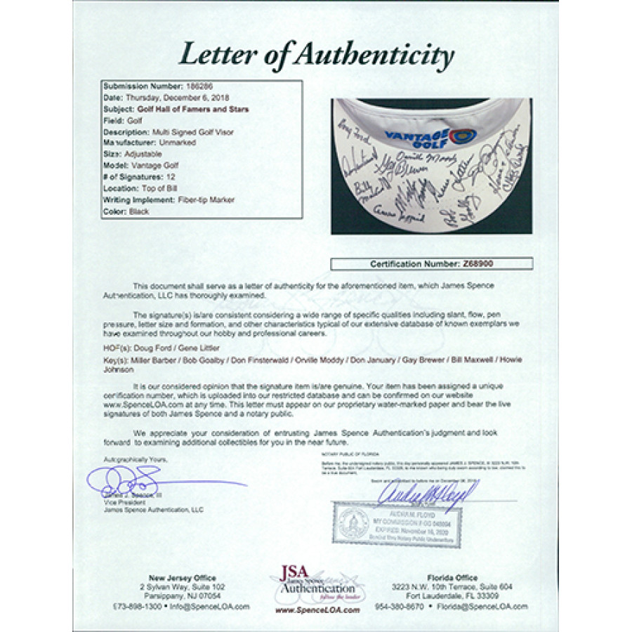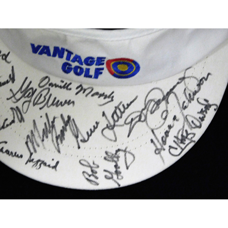 Signed Doug Ford, Gene Littler, Miller Barber, Bob Goalby, Don Finsterwald, Orville Moddy, Don January, Gay Brewer, Bill Maxwell, Howie Johnson and more Vantage Golf Visor in black sharpie by all. The autographs has been certified by James Spence Authentication (JSA) with sticker on item and matching letter.