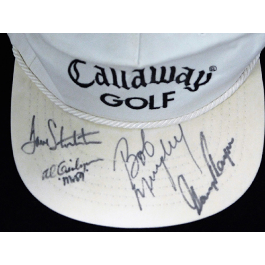 Signed Gary Player, Dave Stockton, Bob Murphy and Al Geiberger Callaway Golf Hat. Hat has been worn by somebody and shows dirt and stains throughout. The autographs has been certified by James Spence Authentication (JSA) with sticker on item and matching letter.