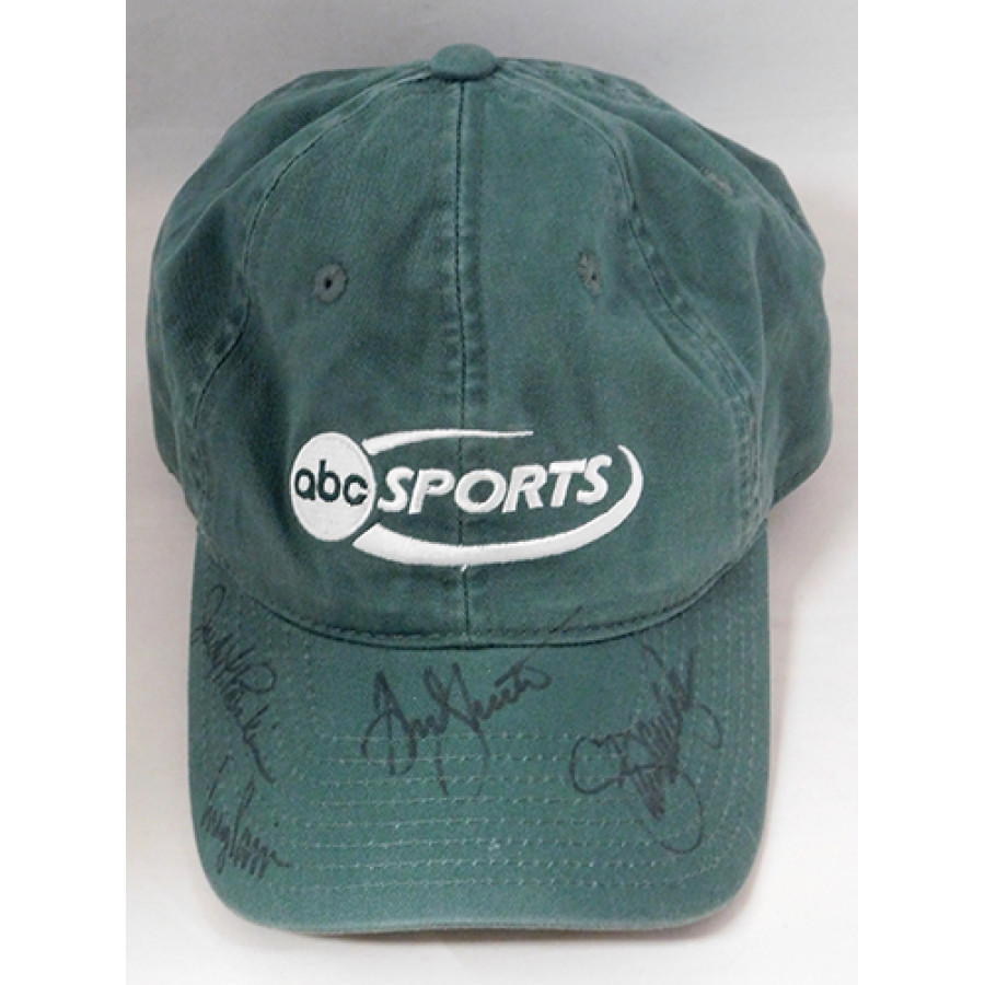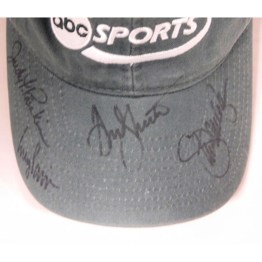 Signed Corey Pavin, Judy Rankin and two More ABC Sports Hat in black sharpie by all. Hat has been worn by somebody and shows dirt and stains throughout. The autographs has been certified by James Spence Authentication (JSA) with sticker on item and matching card.
