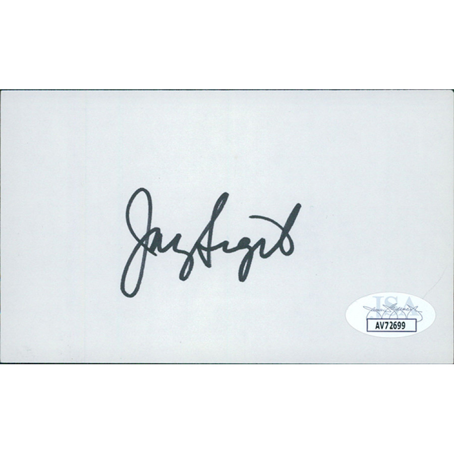 Signed Jay Sigel 3x5 index card in black sharpie. This item has been certified by James Spence Authentication (JSA) with sticker affixed to item and matching card.
