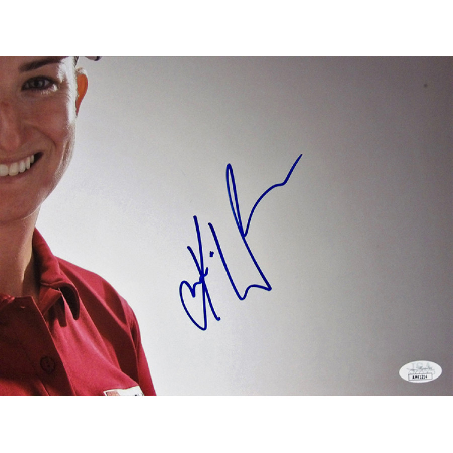 Signed Karrie Webb 12x18 glossy finish photo in blue sharpie. This item has been certified by James Spence Authentication (JSA) with sticker affixed to item and matching card.