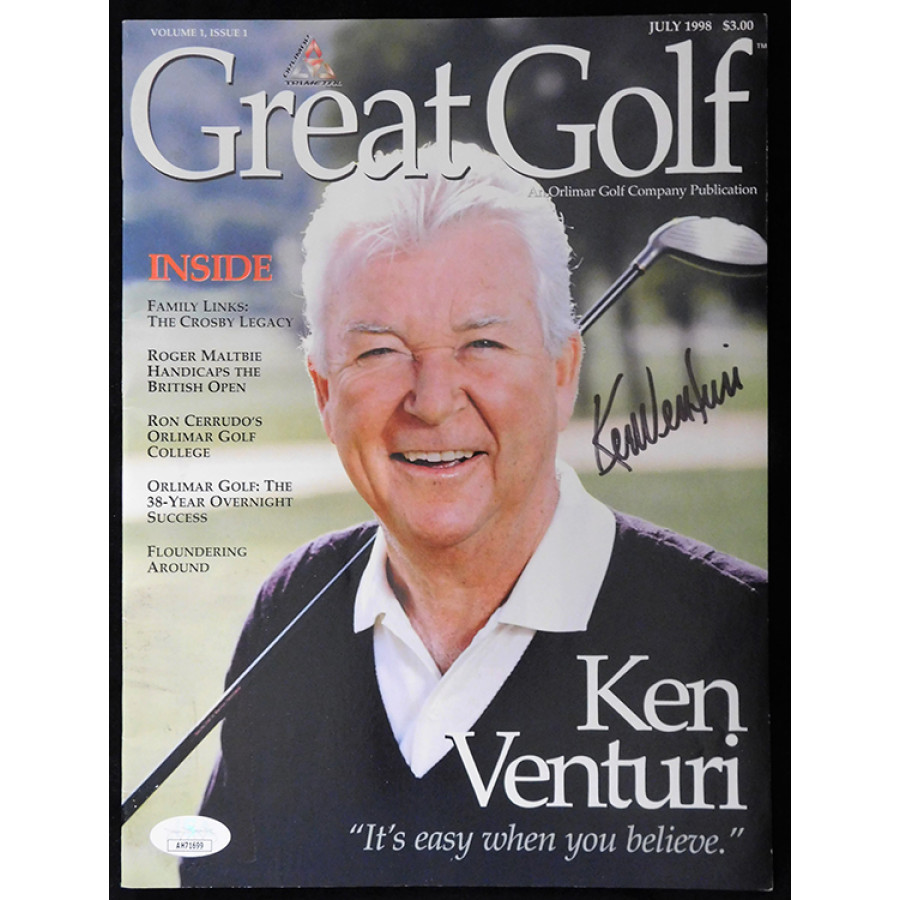Signed Ken Venturi July 1988 Great Golf Magazine in black sharpie. This item has been certified by James Spence Authentication (JSA) with sticker affixed to item and matching card.