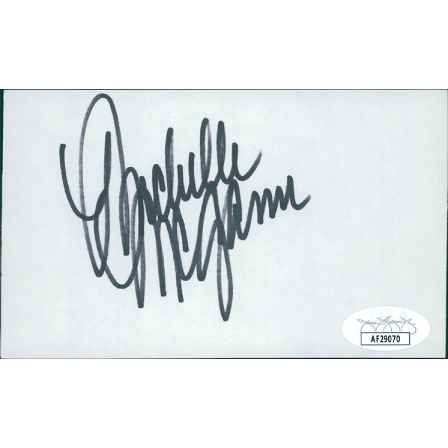 Signed Michelle McGann 3x5 Index Card in black sharpie. This item has been certified by James Spence Authentication (JSA) with sticker affixed to item and matching card.