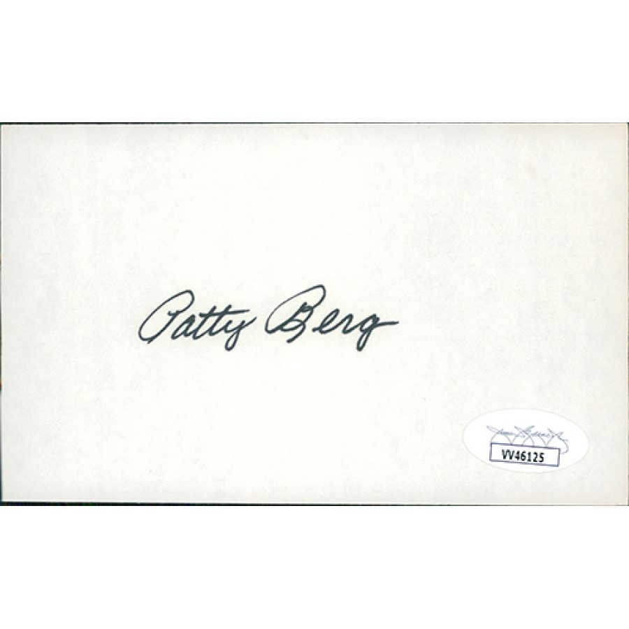 Signed Patty Berg 3x5 Index Card in black ink. This item has been certified by James Spence Authentication (JSA) with sticker affixed to item and matching card.