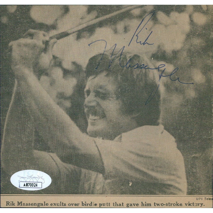 Signed Rik Massengale 5x5 cut newspaper page in blue ink. The page has some light creases. This item has been certified by James Spence (JSA) Authentication with sticker affixed to item and matching card.
