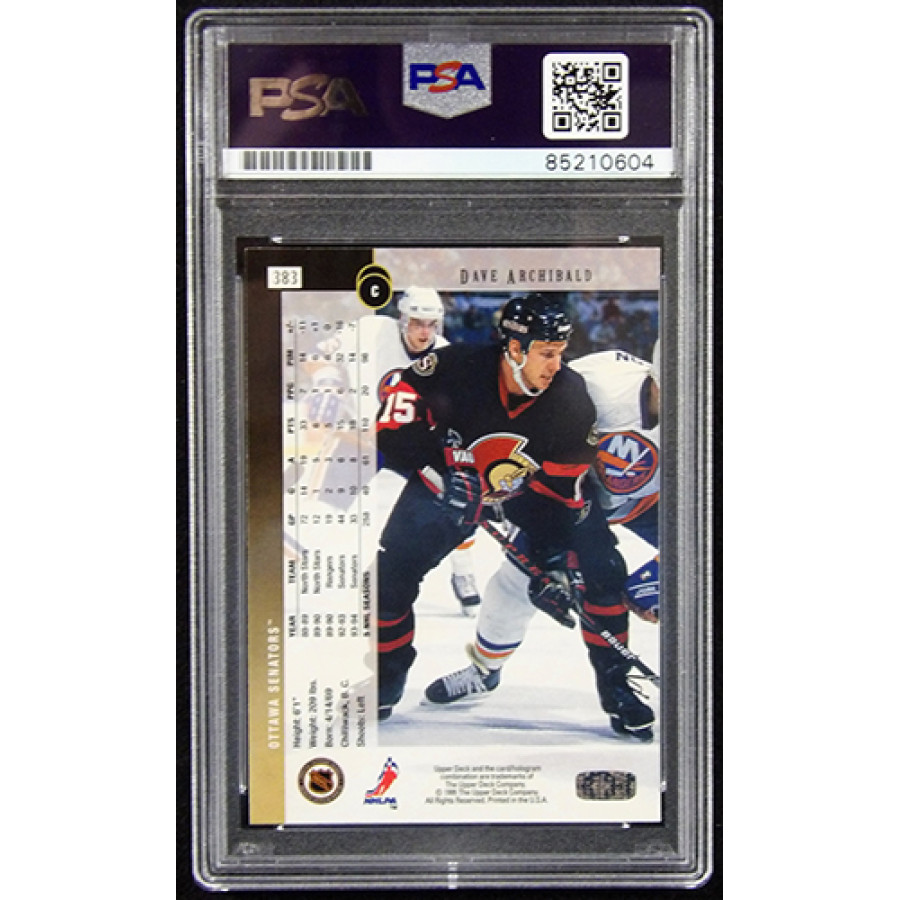 Signed Dave Archibald Ottawa Senators 1994-95 Upper Deck hockey card #383 in gold ink. This item is certified by Professional Sports Authenticators (PSA) encapsulated.