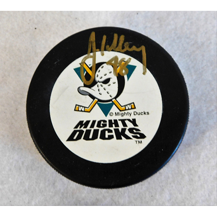 Signed John Lilley Anaheim Mighty Ducks Hockey Puck in gold ink. This item has been certified by James Spence Authentication (JSA) with sticker affixed to item and matching card.