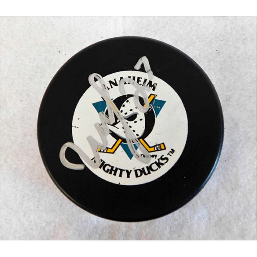 Signed Stanislav Chistov Anaheim Mighty Ducks Hockey Puck in silver ink. This item has been certified by James Spence Authentication (JSA) with sticker affixed to item and matching card.