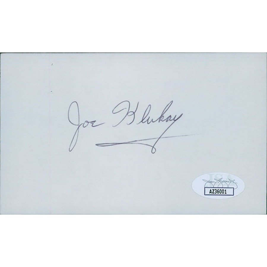 Signed Joe Klukay 3x5 Index Card in black ink. This item has been certified by James Spence Authentication (JSA) with sticker affixed to item and matching card.