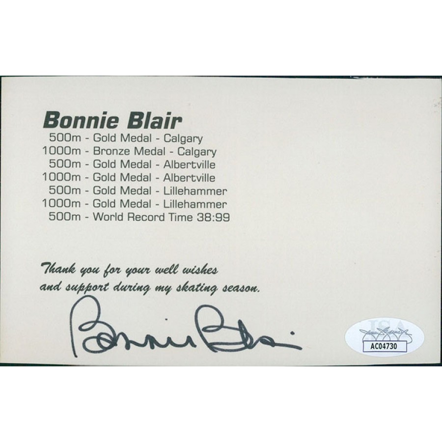 Signed Bonnie Blair 3.5x5.5 cardstock promo photo in black sharpie on the back. This item has been certified by James Spence Authentication (JSA) with sticker affixed to item and matching card.
