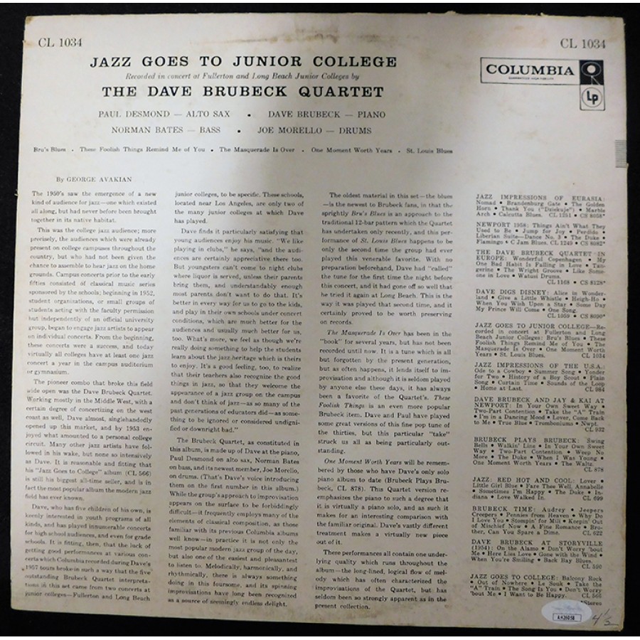 Signed Dave Brubeck Jazz Goes To Junior College Record Album on the cover in blue pen personalized. The album does shows use and has scuffing, tearing and kinks throughout. This item has been certified by James Spence Authentication (JSA) with sticker affixed to item and matching card.