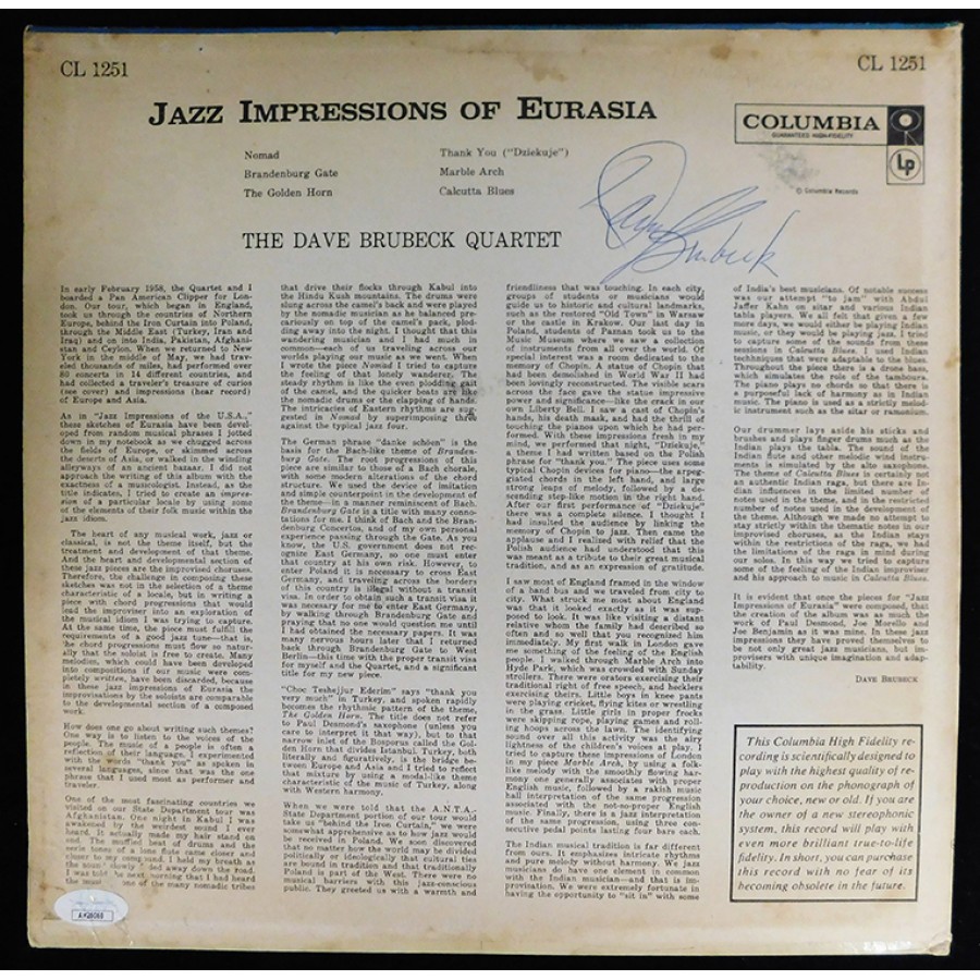 Dave Brubeck Jazz Impressions of Eurasia Signed LP Album JSA Authenticated