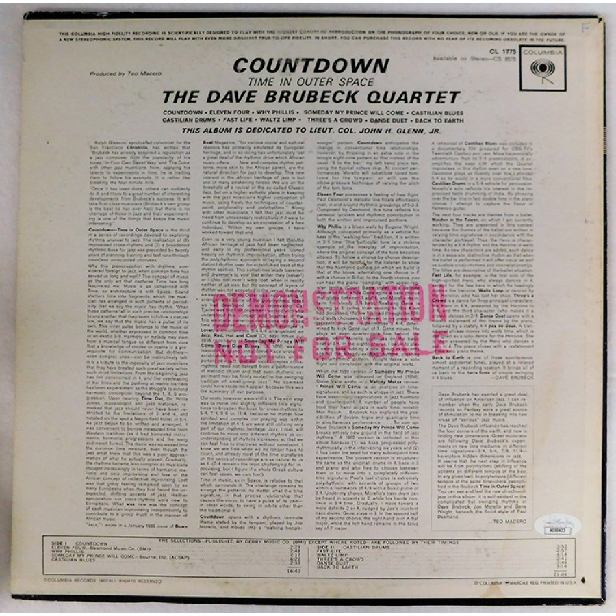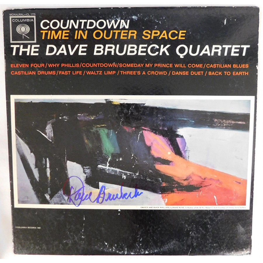 Signed Dave Brubeck Quartet Countdown Time In Outer Space Record Album on the cover in blue sharpie. The album does shows use and has scuffing, creases and wearing. This item has been certified by James Spence Authentication (JSA) with sticker affixed to item and matching card.