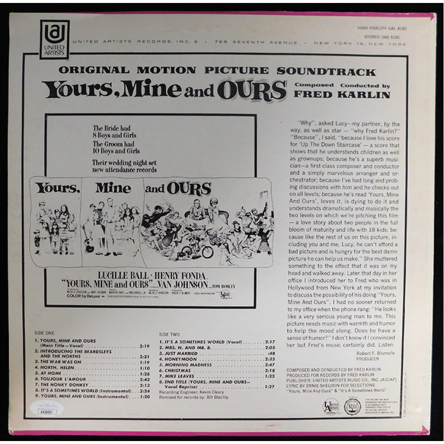 Fred Karlin Composer Signed Yours, Mine and Ours LP Album JSA Authenticated