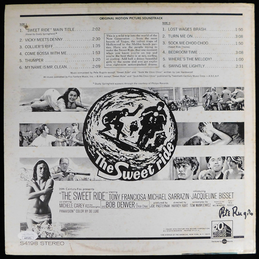 Signed Pete Rugolo The Sweet Ride Record Album on the back cover in black sharpie. The album does shows use and has scuffing, tearing and kinks throughout. This item has been certified by James Spence Authentication (JSA) with sticker affixed to item and matching card.