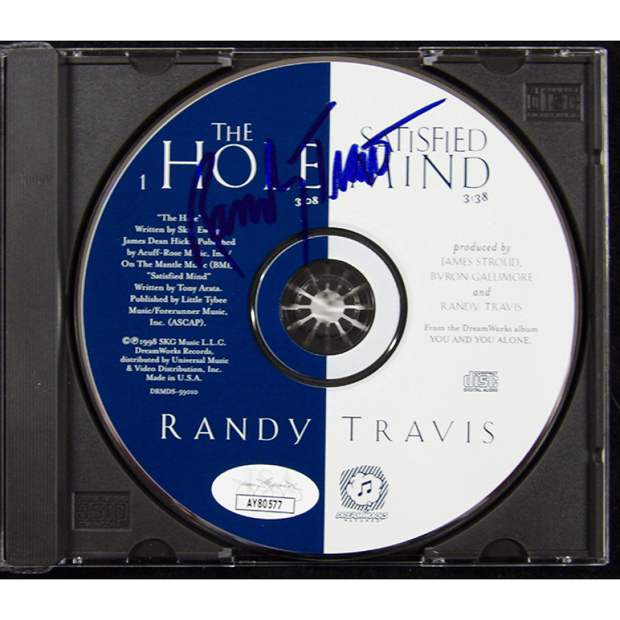 Signed Randy Travis The Hole CD in blue sharpie. It does includes case but is considered to be in used condition. This item has been certified by James Spence Authentication (JSA) with sticker affixed to item and matching card.