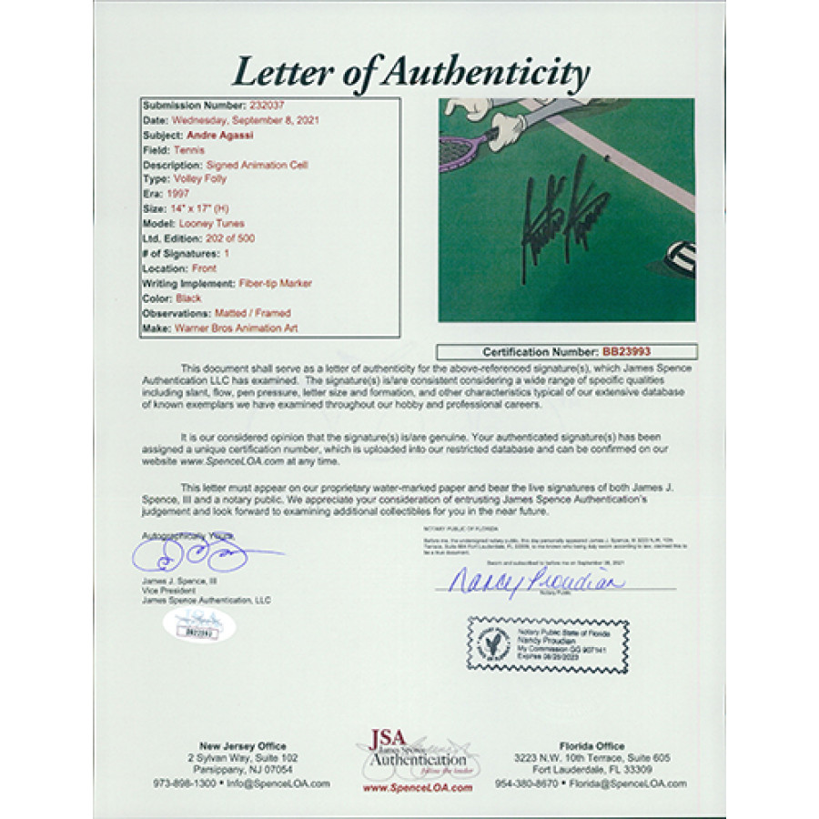 Signed Andre Agassi Limited Edition Warner Brothers Animation Cel Volly Folly Framed. This is numbered 55 of 500. The frame measures 24.5x27.5. This item is certified by Warner Brothers and James Spence Authentication (JSA) with letter of authenticity.