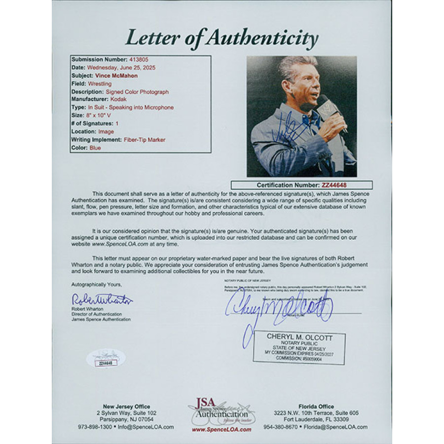 Signed Vince McMahon 8x10 matte finish photo in blue sharpie. Photo has light dirt marks in the top right area. This item has been certified by James Spence Authentication (JSA) with letter of authenticity.
