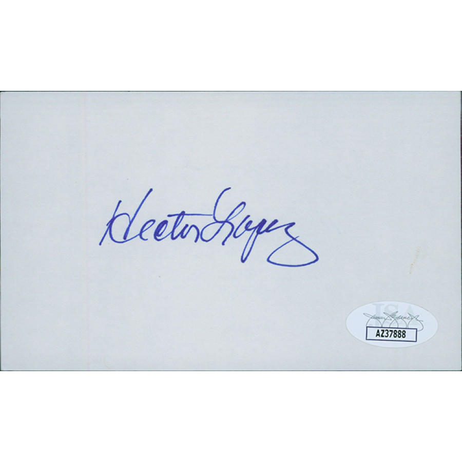 Signed Hector Lopez 3x5 index card in blue ink. This item has been certified by James Spence Authentication (JSA) with sticker affixed to item and matching card.