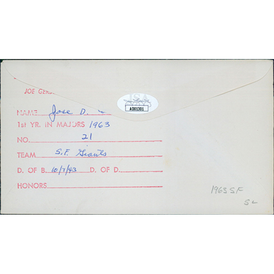 Signed Jose Cardenal Professional Baseball Stamped Envelope Cachet in blue pen. There is a card affixed to the envelope. This item has been certified by James Spence Authentication (JSA) with sticker on item and matching card.