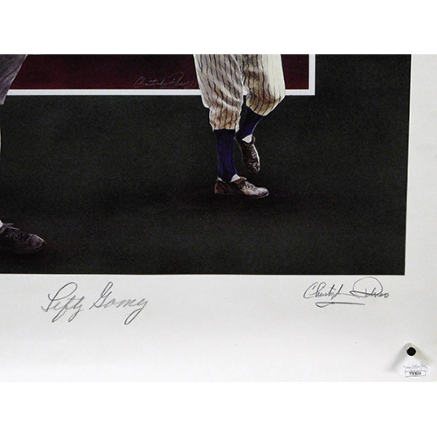 Signed Lefty Gomez New York Yankees limited edition lithograph in pencil. This lithograph is by the artist Christopher Peluso and it's signed by Peluso too. This is number 532 of 800. There are 4 major creases going through and some other inks and dents. This item is certified by James Spence Authentication (JSA) with sticker affixed to item and matching card.