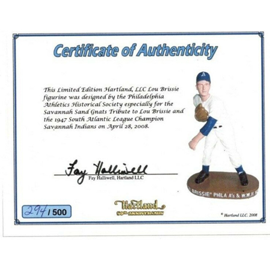 Signed Lou Brissie 6" tall porcelain figurine number 294 out of 500. This figurine is made by the Hartland company. This item has been authenticated by James Spence Authentication (JSA) with sticker affixed to item and matching card.