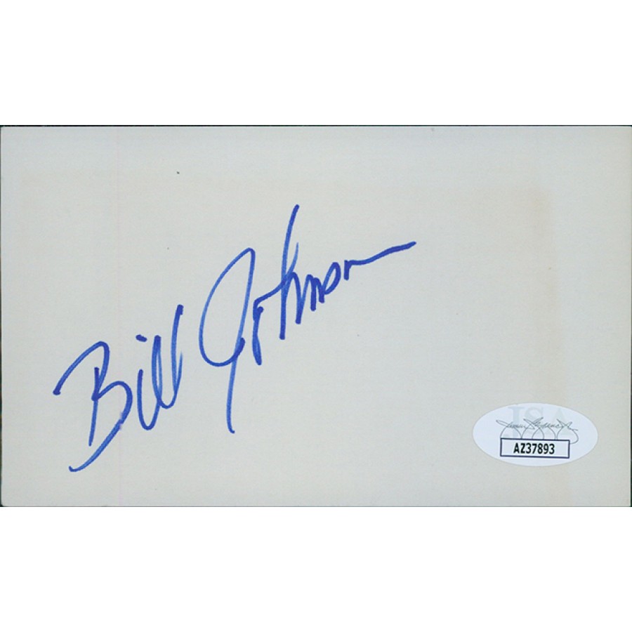 Signed Bill Johnson 3x5 Index Card in blue sharpie. This item has been certified by James Spence Authentication (JSA) with sticker affixed to item and matching card.