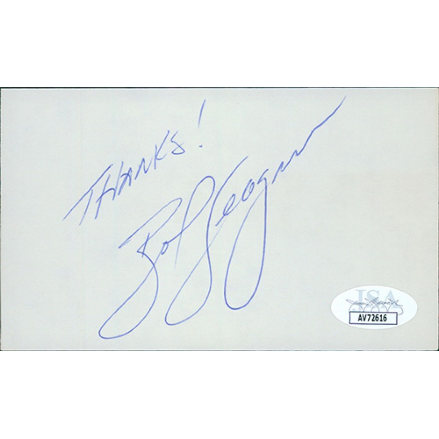 Signed Bob Seagren 3x5 index card in blue ink. This item has been certified by James Spence Authentication (JSA) with sticker on item and matching card.