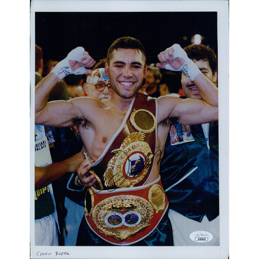 Signed Oscar De La Hoya 8.5x11 cardstock photo in black ink. This item has been certified by James Spence Authentication (JSA) with sticker affixed to item and matching card.